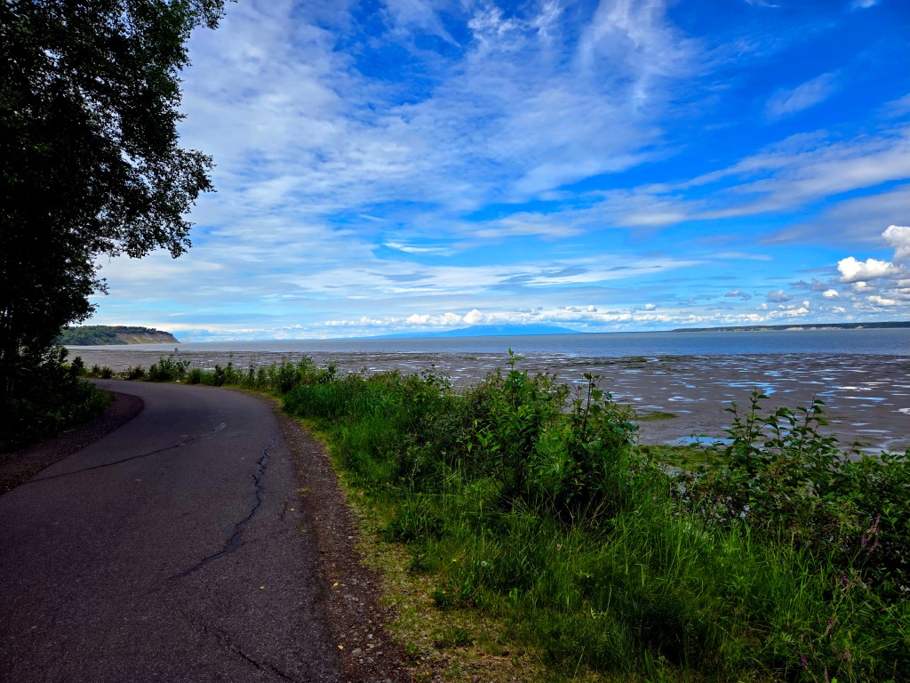 A) Tony Knowles Coastal Trail and Earthquake Park: One of the main things we did in Anchorage was walk a portion of this trail which is often described as one of the highlights of Anchorage. We parked across from Elderberry Park, where there is convenient public parking, and started our walk from there. From that point, we walked toward Earthquake Park and then turned back, covering roughly six miles round trip. While this is still a decent amount of walking, it felt manageable and relaxed rather than rushed, which was exactly what we wanted for our first full day in Alaska. The trail itself is very easy and fully paved, making it suitable for walking, biking, or even e-biking. We saw plenty of cyclists and families along the way, and in hindsight, biking would likely have been the better way to experience it. The walk was pleasant, especially with good weather, but we personally found it a bit overhyped compared to coastal trails we’ve experienced elsewhere. While there are ocean views along the route, the water is often quite far from the trail due to tidal patterns, and the mountains, though beautiful, felt distant. The greenery along the trail is lush, and there are some lovely homes overlooking the coast, but overall, the scenery didn’t feel as dramatic as we had expected. That said, it was still a nice, low-key way to spend a few hours, especially on a jet-lag recovery day. If you’re short on time in Anchorage, this is something you could easily skip without feeling like you missed out. If you do want to experience it, biking a portion of the trail would likely make it more enjoyable and efficient.