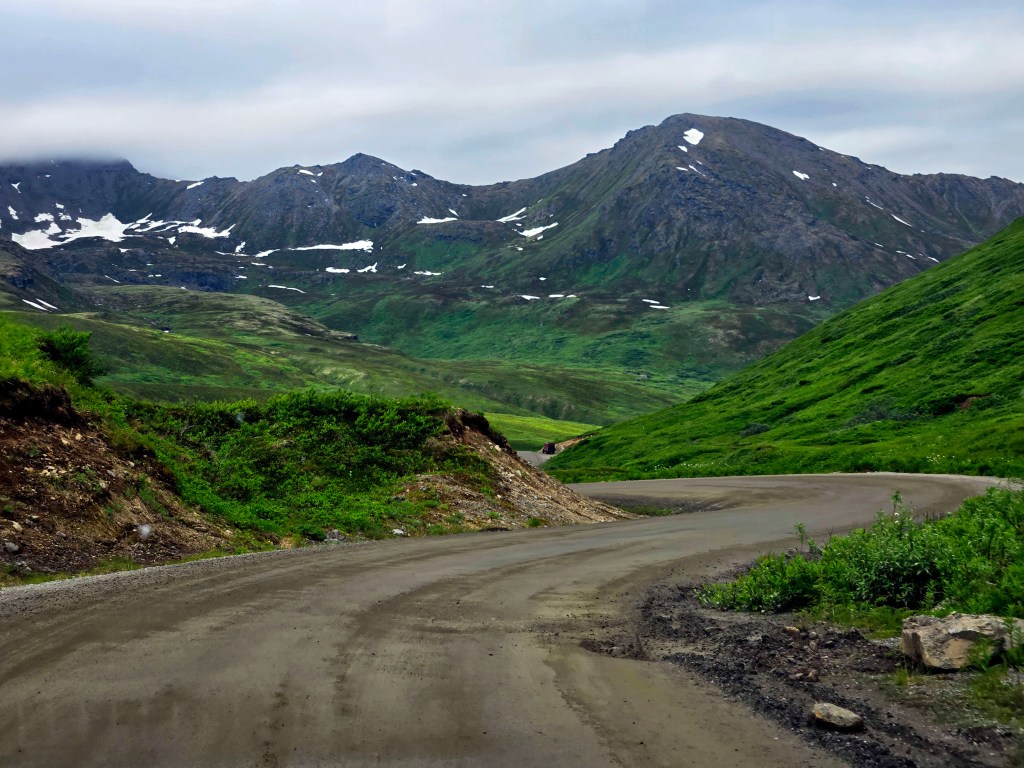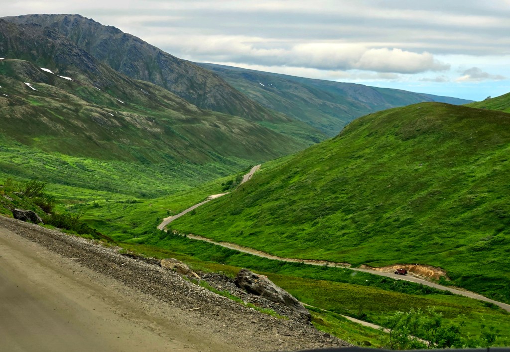 B)Hatcher Pass: Hatcher Pass is a spectacular alpine recreation area located in Alaska’s Talkeetna Mountains, known for its dramatic scenery, rugged mountain terrain, and deep ties to Alaska’s gold-mining history. The drive along Hatcher Pass Road offers sweeping views of jagged peaks, valleys, and tundra-like landscapes, making it one of the most scenic mountain passes in Southcentral Alaska. The upper portion of Hatcher Pass Road is unpaved, with loose gravel, steep sections, and sharp curves. While it’s absolutely drivable, it can feel a bit uncomfortable at times, especially for smaller or low-clearance vehicles. We were glad to have an all-wheel-drive SUV, which made the drive feel much more manageable. That said, we saw a variety of vehicles on the road, and as long as you drive slowly and carefully, it’s very doable. Access to the high-elevation portion of the pass is seasonal, typically open from July through September, depending on snow conditions. The lower areas are accessible year-round and are popular for winter sports. We didn’t stop for any long hikes here, as our priority was making it to Healy before evening. Instead, we drove through the pass and stopped at two scenic pullouts, including one near the top, to take everything in. Even without hiking, the views were stunning and absolutely worth the drive. Hatcher Pass is also home to Independence Mine State Historical Park, which preserves remnants of Alaska’s gold rush era. This area is popular for hiking, photography, berry picking in late summer, winter skiing, and even gold panning.