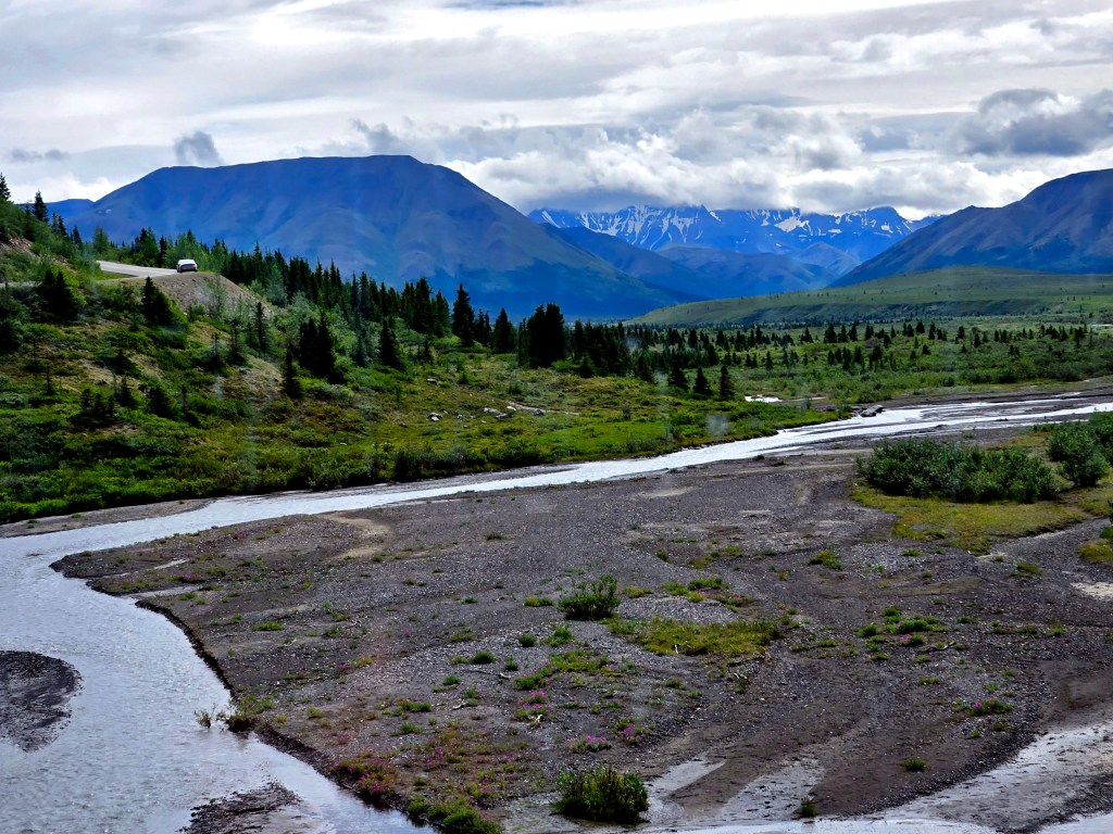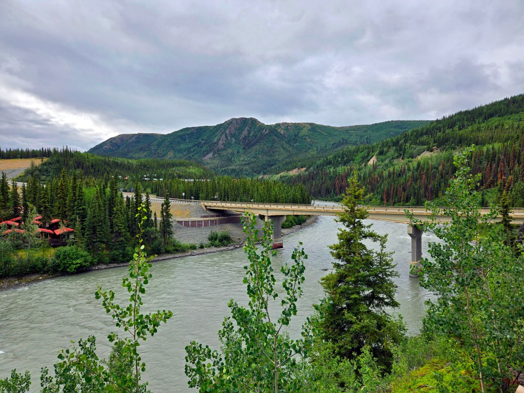 D) Continuing onto Healy: After lunch and a short walk around Talkeetna, we got back on the road and continued north to Healy, arriving in the evening. It was a long day, but one that felt incredibly rewarding combining dramatic scenery, Alaska history, and one of the most iconic experiences the state has to offer. We didn’t stop anywhere on the drive from Talkeetna to Healy that day, but there are a couple of commonly recommended pullouts: Denali Viewpoint South and Denali Viewpoint North. We actually stopped at one of these viewpoints on our return drive, mostly out of curiosity. While these viewpoints do offer a chance to see Denali on a clear day, the peak is very far away and can be hard to spot unless you’re actively looking for it. Given that we had already seen Denali up close from the flight and later within Denali National Park itself, the viewpoints didn’t feel particularly impactful to us. That said, if you don’t get a chance to see Denali at all, due to weather, timing, or skipping flightseeing; these viewpoints maybe worth a quick stop. Just keep expectations realistic. Even on a clear day, Denali can be elusive, and if you didn’t see it in Denali National Park, chances are you may not see it clearly from the highway either.