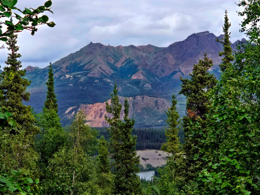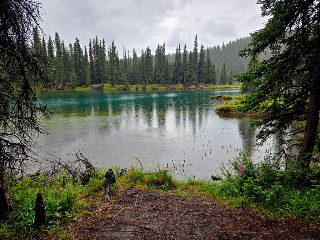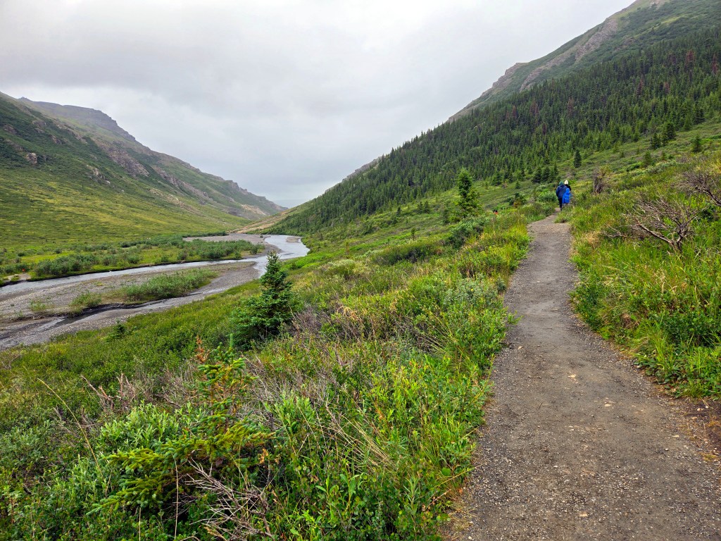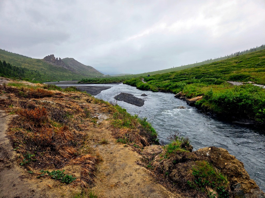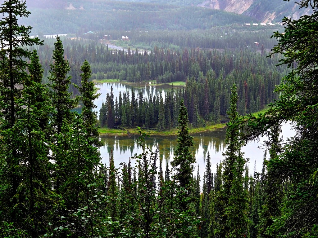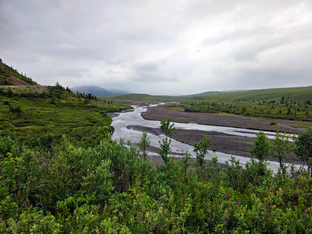 C) Horseshoe Lake Trail: We started our second day with the Horseshoe Lake Trail, one of the most popular and rewarding short hikes in Denali. Although it’s often listed as a 2-mile hike, it ends up being closer to 4 miles round trip, when you start at the visitors center. The hike itself is easy to moderate and absolutely worth the effort. We did it on a lightly rainy, foggy day, and even then, or perhaps because of it, the scenery was spectacular. A rain jacket came in handy, but the trail was very manageable. One of the nicest surprises was the sudden view of the gushing Nenana River where you can often see rafting groups floating by. As you descend toward Horseshoe Lake, the landscape opens up into a stunning scene: turquoise-blue water, surrounded by lush green and brown forest, with towering mountains rising behind it. Reaching the lake level was truly mesmerizing and offered some of the most beautiful photo opportunities of our time in Denali. If you’re choosing just one short hike in the park, this would easily be a must-do.