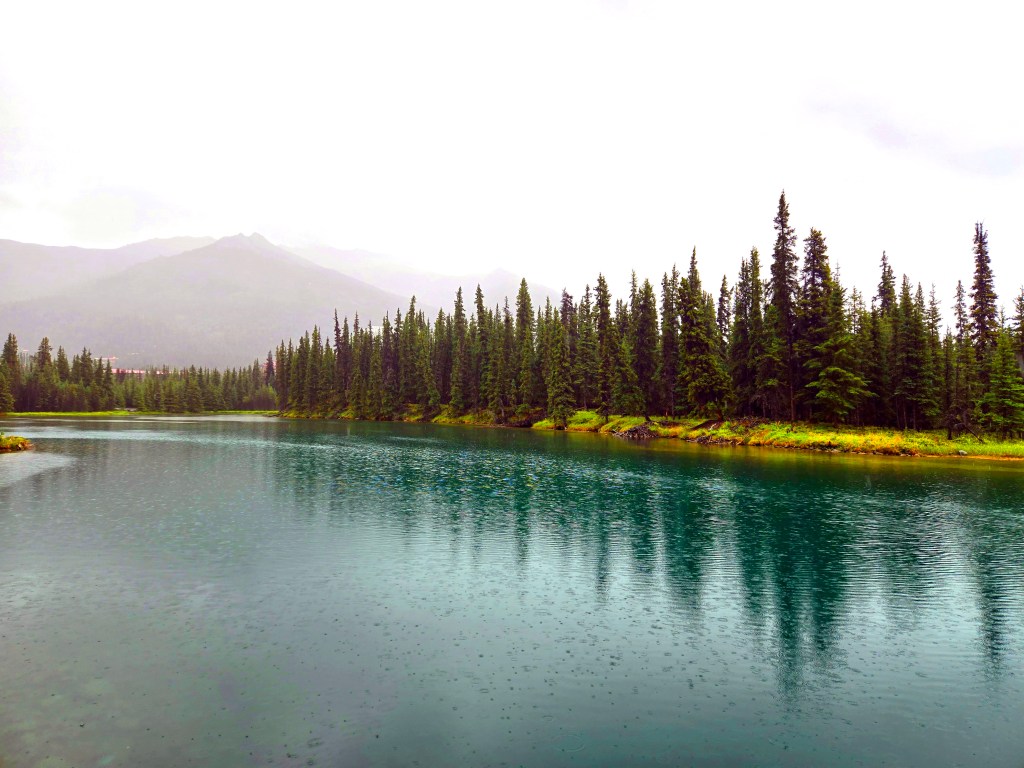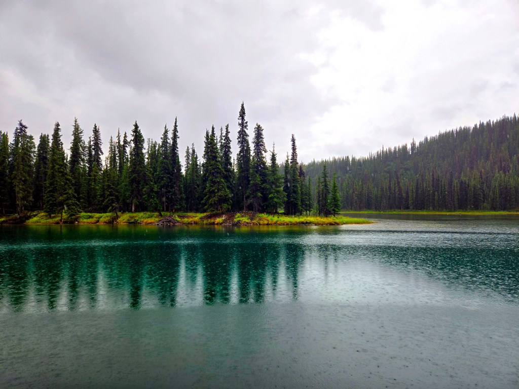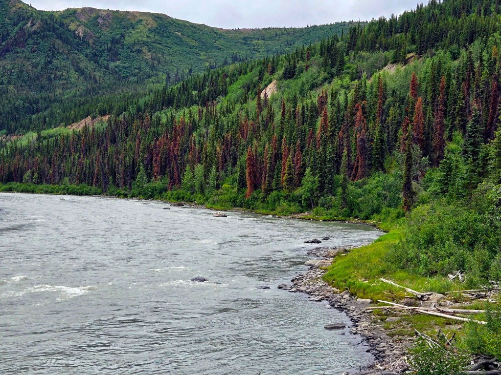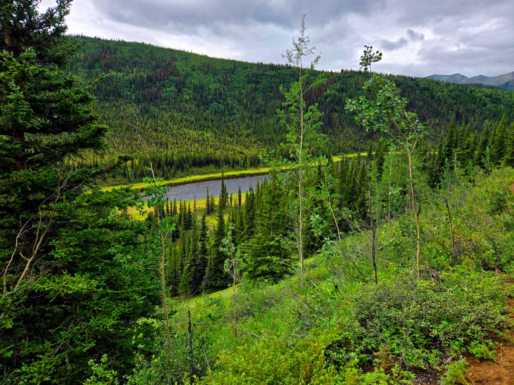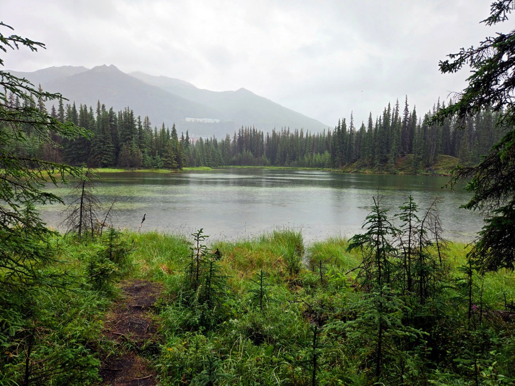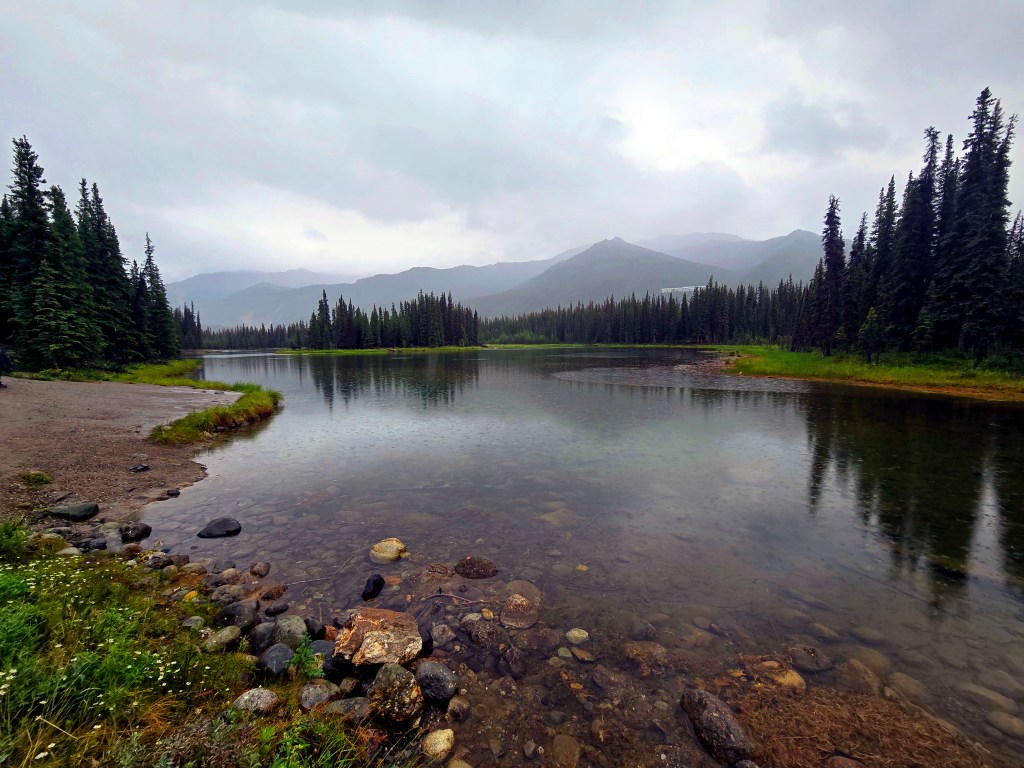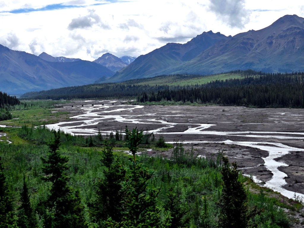 C) Horseshoe Lake Trail: We started our second day with the Horseshoe Lake Trail, one of the most popular and rewarding short hikes in Denali. Although it’s often listed as a 2-mile hike, it ends up being closer to 4 miles round trip, when you start at the visitors center. The hike itself is easy to moderate and absolutely worth the effort. We did it on a lightly rainy, foggy day, and even then, or perhaps because of it, the scenery was spectacular. A rain jacket came in handy, but the trail was very manageable. One of the nicest surprises was the sudden view of the gushing Nenana River where you can often see rafting groups floating by. As you descend toward Horseshoe Lake, the landscape opens up into a stunning scene: turquoise-blue water, surrounded by lush green and brown forest, with towering mountains rising behind it. Reaching the lake level was truly mesmerizing and offered some of the most beautiful photo opportunities of our time in Denali. If you’re choosing just one short hike in the park, this would easily be a must-do.