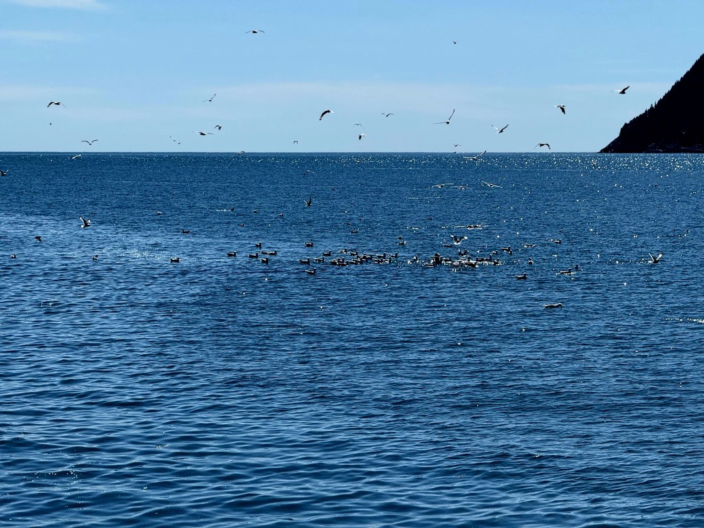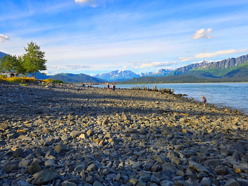 B) Seward Waterfront: After arriving in Seward, we spent a relaxed hour or two walking along the waterfront, which turned out to be a perfect way to ease into the town after a long drive. The Seward waterfront is flat, paved, and very easy to walk, making it ideal for a casual evening stroll rather than a planned hike. The main walking path runs along Seward Waterfront Park and the harbor area and can easily be adjusted in length depending on how far you want to go. You can walk a short loop near the harbor or extend it farther along the shoreline; overall, you can comfortably spend 1–2 hours here without feeling rushed. One interesting aspect of the waterfront is that it also functions as a campground, with several RVs and camper vans parked along the shoreline. Seeing people settled in for the night with views of the water and mountains adds to Seward’s relaxed, outdoorsy vibe. There are also playgrounds for kids, making this a family-friendly area where children can burn off energy while adults enjoy the views. The path itself is paved ( ~2miles) but if you want to get closer to the water, you can easily step off onto the rocky and pebbled shoreline, which many people do. It’s a nice option if you want to sit closer to the water, skip stones, or just enjoy the sound of the waves. The waterfront is also a great place for marine life spotting, even without taking a boat tour. While walking, you’ll often see sea otters floating near the harbor, seabirds like gulls and puffins, and occasionally sea lions lounging near docks or buoys. The harbor itself is lively, with fishing boats, tour boats, and kayaks coming and going, which adds a sense of energy without feeling crowded. Overall, the Seward waterfront felt like a calm, welcoming introduction to the town — scenic, accessible, and unpretentious.