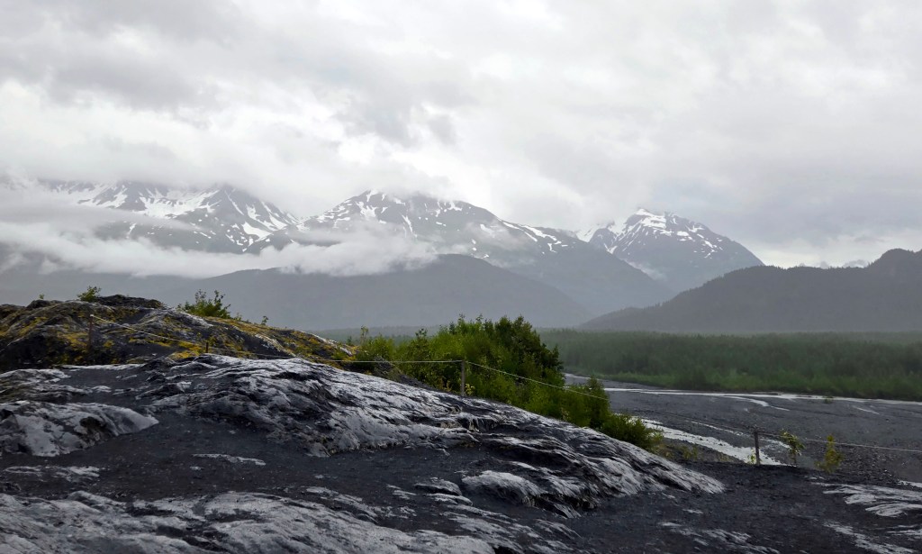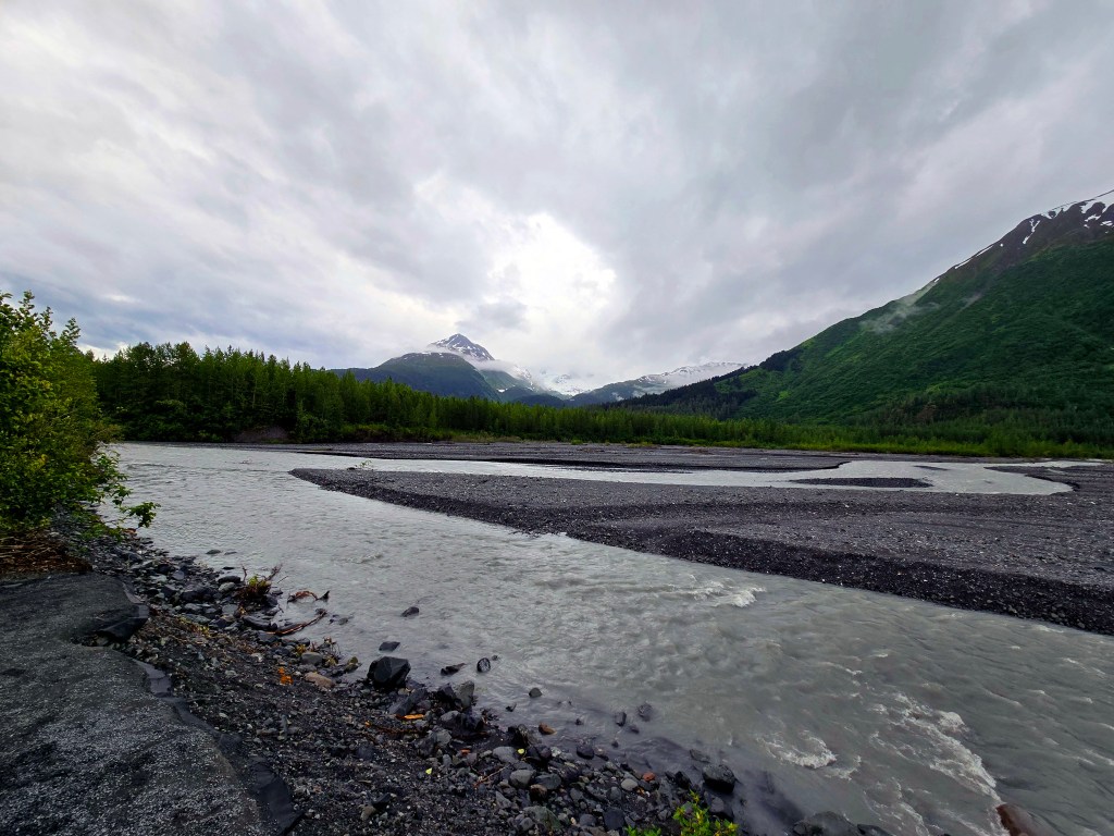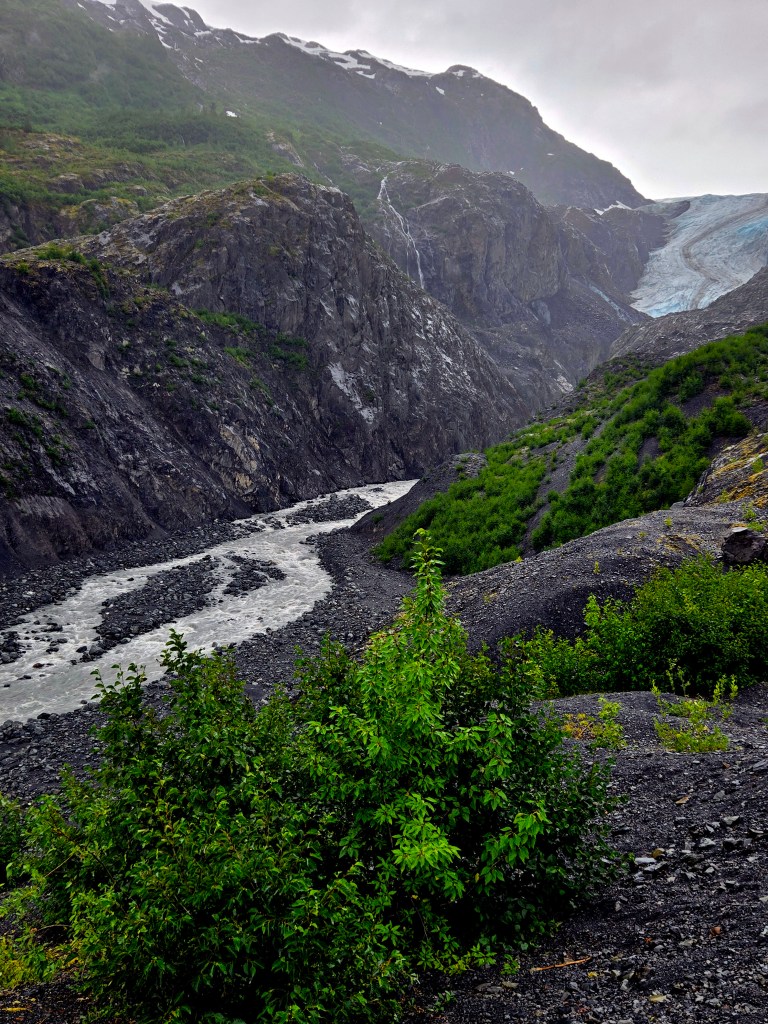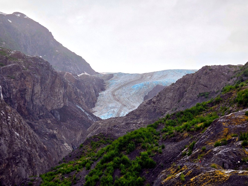 C) Exit Glacier: The Exit Glacier area is one of the most accessible and dramatic places to experience glacial landscapes in Alaska. Located just outside Seward within Kenai Fjords National Park, it offers visitors the rare opportunity to walk right up to a glacier and, for those up for a challenge, hike toward the vast Harding Icefield, which feeds dozens of glaciers across the region. On this day, I wasn’t feeling well and stayed back, while the rest of the group headed out to explore the area. Because of weather conditions and timing, they spent only a few hours here and didn’t attempt the full Harding Icefield hike, but even that limited time still offered an impressive glimpse into Alaska’s icy landscapes.The Exit Glacier itself is easily accessible via a short walk from the parking area and can be completed within 30-60mins. This makes it one of the few glaciers in Alaska that you can reach without extensive hiking or special equipment. Well-marked trails and interpretive signs show how dramatically the glacier has retreated over the past century, offering a powerful visual reminder of climate change. Even on a rainy day, the glacier area has a moody, dramatic beauty with mist rolling over ice, glacial runoff streams cutting through the valley, and dense green vegetation surrounding the ice. My group mentioned that the rain made the experience quieter and more atmospheric, though it also limited how far they wanted to hike.