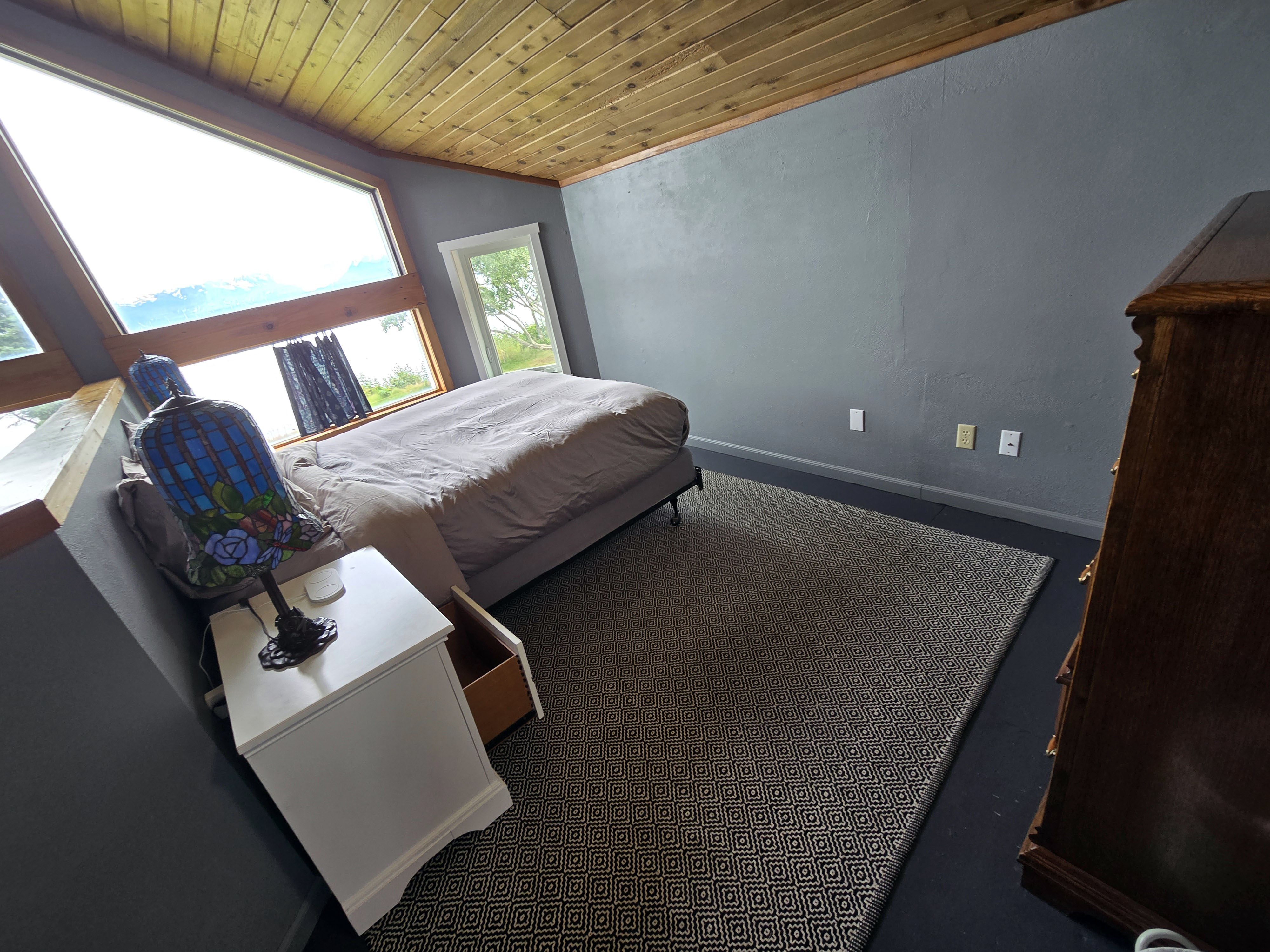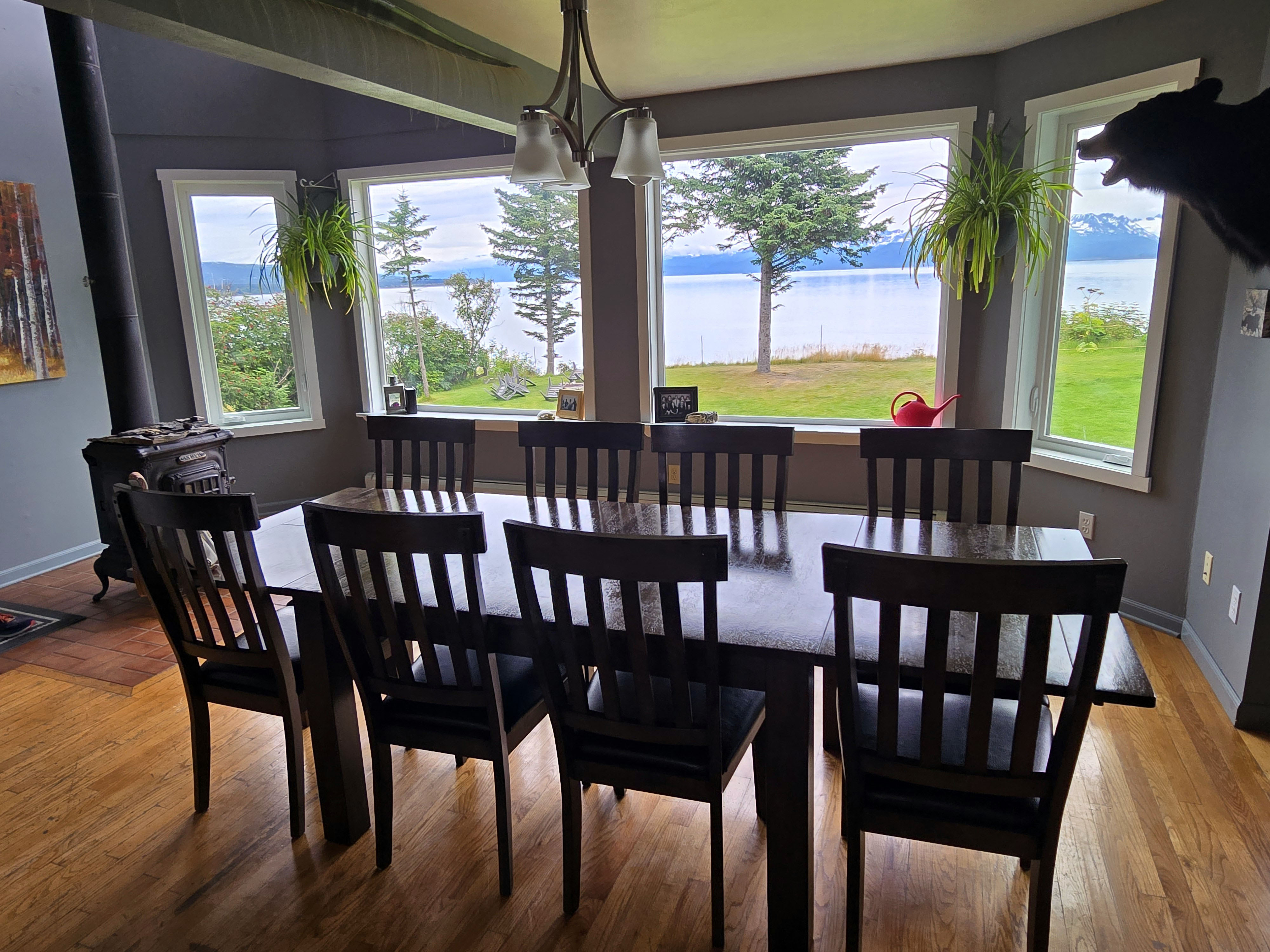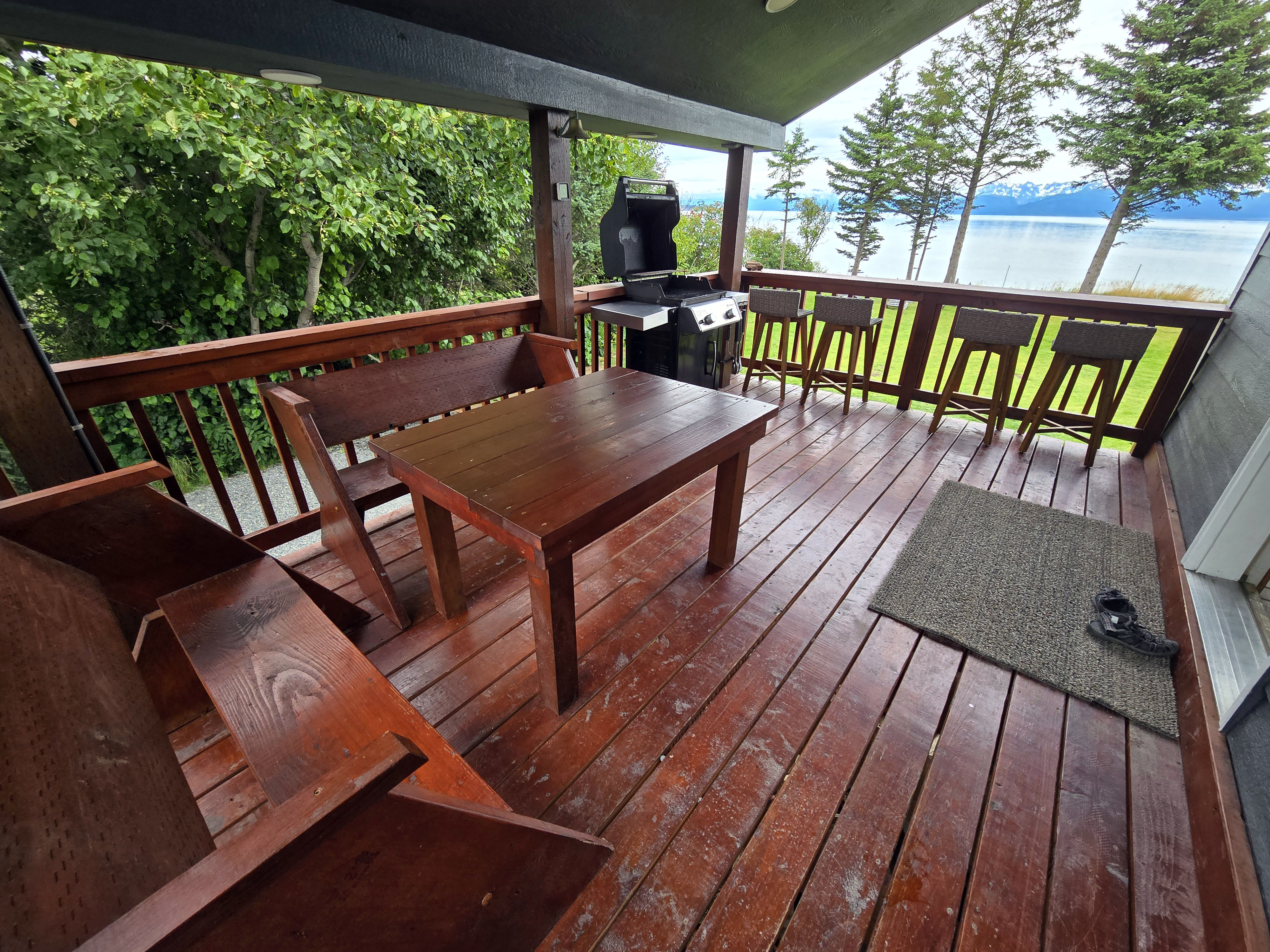 Homer (Kachemak Bay): Our final stay in Homer was, without question, one of the most memorable places we’ve ever stayed. While it wasn’t right in the town center, the location more than made up for it with absolutely breathtaking views over Kachemak Bay, the Grewingk Glacier and other glaciers, and the distant Alaska Range. The scenery was so serene and mesmerizing that we constantly found ourselves stopping just to stare. It was truly hard to look away. Large windows brought the views directly into the house, and the huge backyard offered an equally stunning vantage point, overlooking the bay and glaciers beyond. Whether we were inside or sitting outside, the landscape felt immersive, peaceful, and almost unreal. Watching the light shift across the water and peaks throughout the day was one of the most calming experiences of the entire trip. The outdoor space was especially special. There was plenty of seating outside, and the property had resident chickens that you could feed, along with numerous rabbits–around eight to ten of them, roaming the neighborhood all day. Seeing rabbits of different colors grazing in the yard and nearby areas was delightful, especially for kids, and added a charming, almost storybook feel to the stay. The house itself had three bedrooms and two bathrooms including a loft-style master area, offering plenty of space. Beds were comfortable, and there was a TV in the living room for shared downtime. However, the open loft-style master was ultimately not usable for sleeping. It had large glass windows with no blackout coverage, very little privacy, and became extremely warm, so no one chose to stay there. Thankfully, we had an extra bedroom, which worked out well. One thing worth keeping in mind is that the house had multiple levels and quite a few stairs, when moving between different areas of the home. While this wasn’t an issue for us, it could be inconvenient for elders or anyone who may not be comfortable going up and down stairs frequently, especially given how often you’ll want to move between the living spaces and the outdoor viewing areas. Even with these drawbacks, the views, tranquility, and outdoor experience made this stay extraordinary. It was the perfect place to slow down, reflect, and end our Alaska journey on a deeply peaceful and awe-filled note.